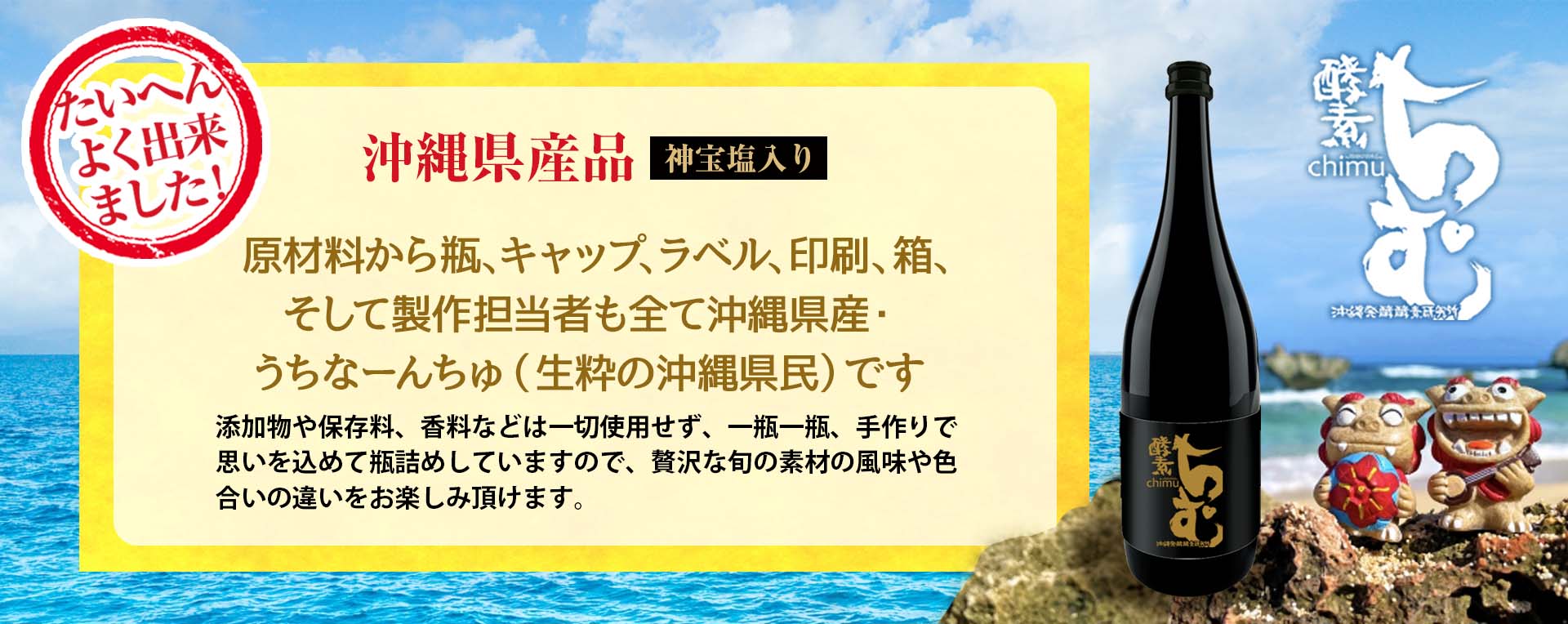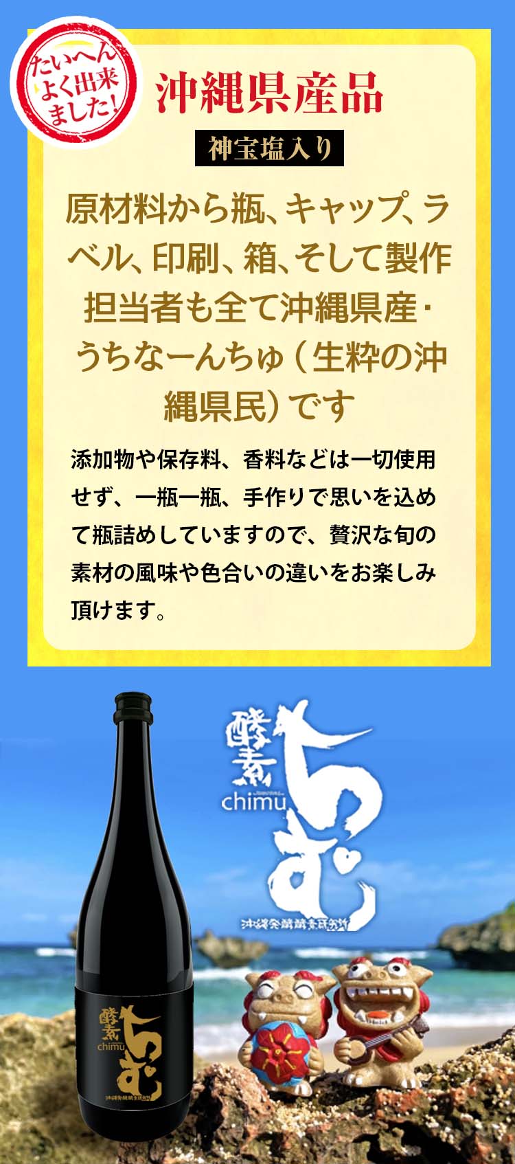 沖縄という島は、ずっと昔から良い事も難しい面も歴史的に様々な出来事が有って、昨今では首里城を焼失してしまうという大変痛ましい事件もありました。 ですが、沖縄はいつだって明るく元気に力いっぱいに前向きなエネルギーに満ち溢れているステキな土地です。 世界中の人々を魅了してやみません。 そんな沖縄のキラキラした魅力を一杯に詰めたこの酵素ドリンク【ちむ酵素】ラベルは、書浪人善隆先生の直筆による書によって力強くイキイキとした”ちむぐくる”(沖縄の言葉で真心の意味)を込めた品となりました。 酵素不足になりがちな、ご家族みなさんの為にお役立て頂ければ嬉しいです。