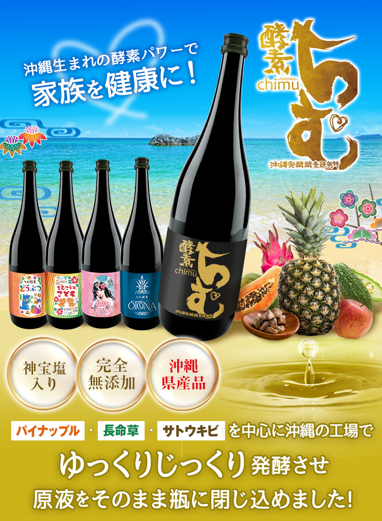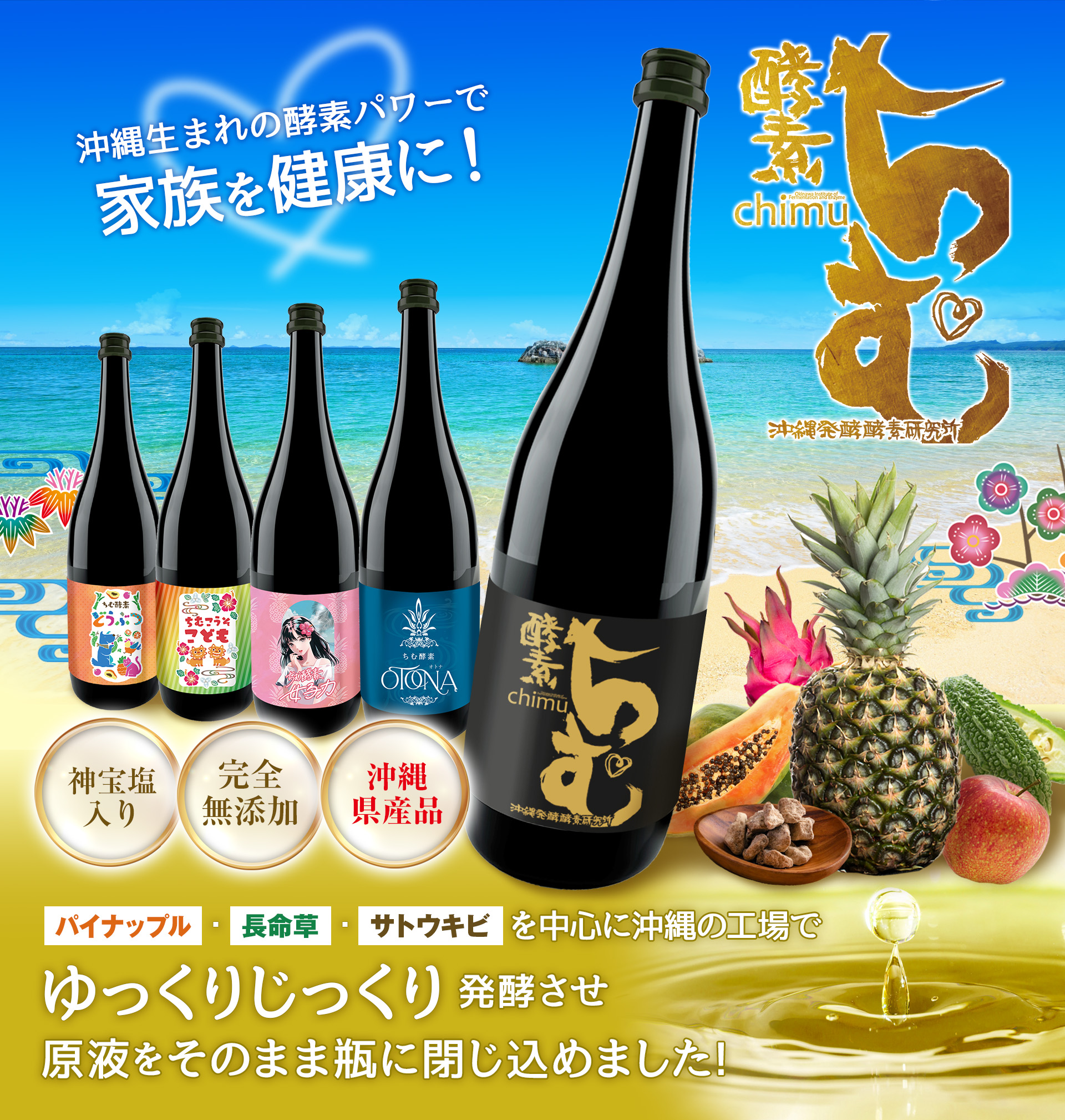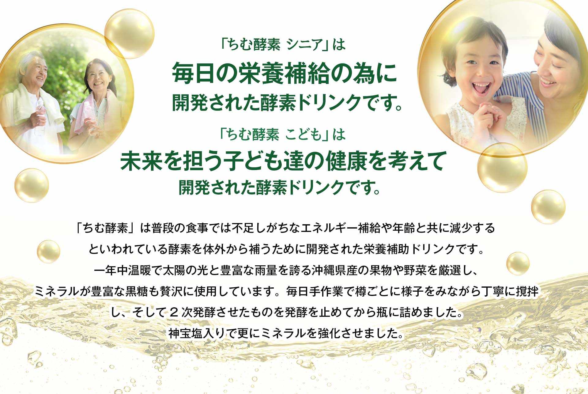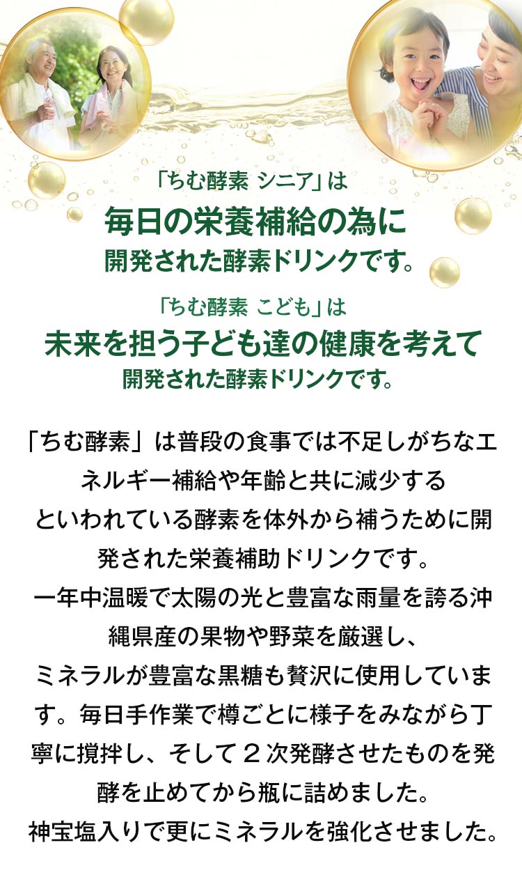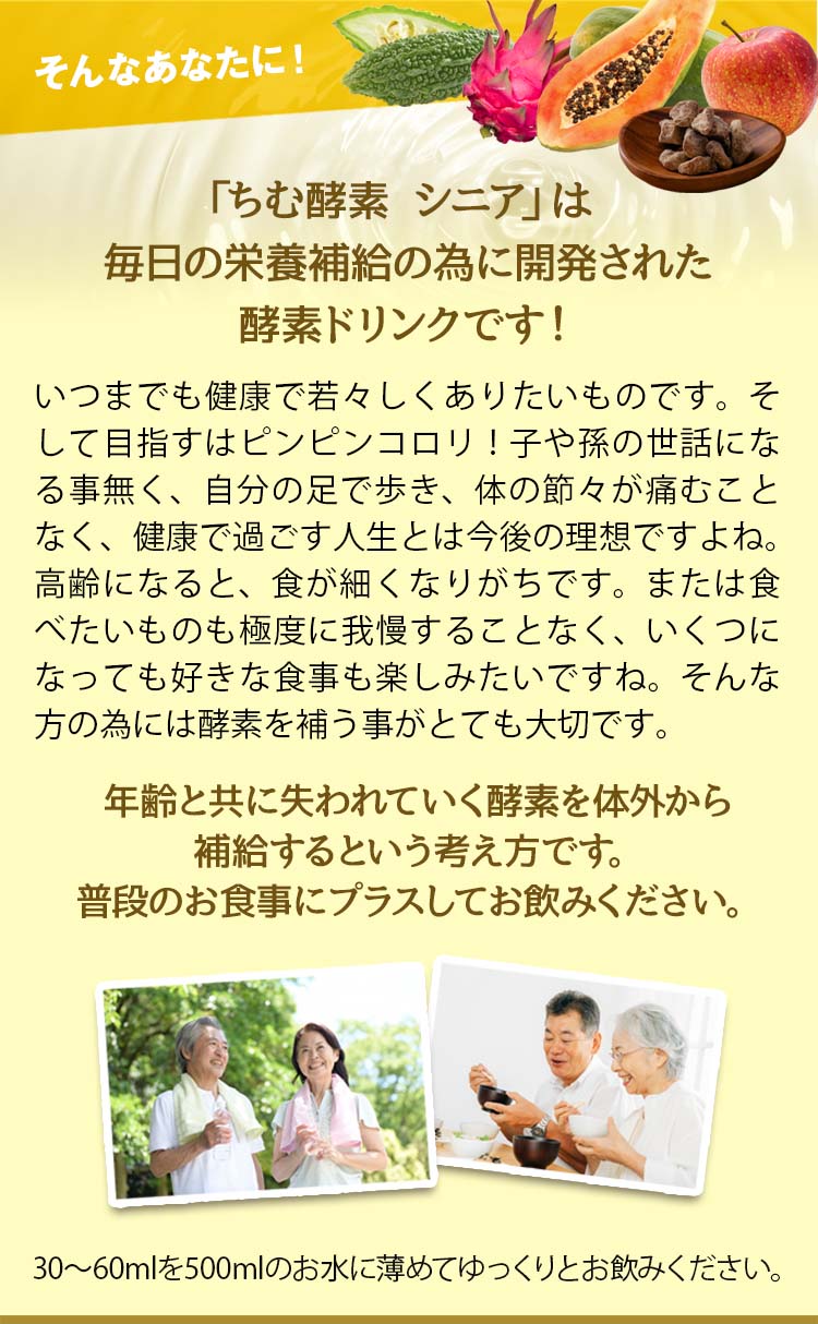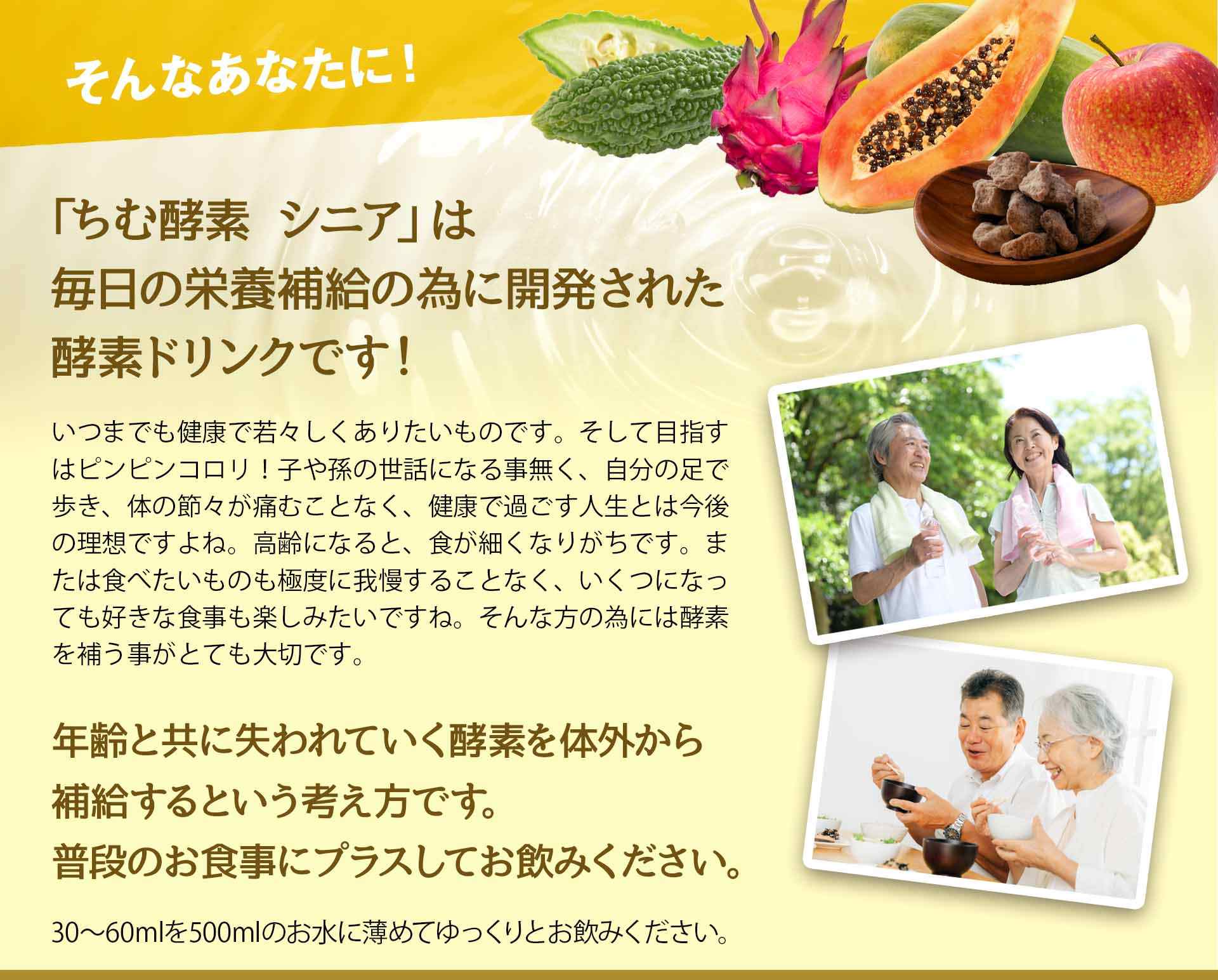 いつまでも健康で若々しくありたいものです。 そして目指すはピンピンコロリ!子や孫の世話になる事無く、自分の足で歩き、体の節々が痛むことなく、健康で過ごす人生とは今後の理想ですよね。 高齢になると食が細くなりがちです。 好き嫌いも主張して栄養も偏りがちですが、いくつになっても好きな食事も楽しみたいですね。 《ちむ酵素シニア》は普段の食事では不足しがちなエネルギーや、年齢等で減少すると言われている酵素を体外から補う為に開発された酵素ドリンクです。