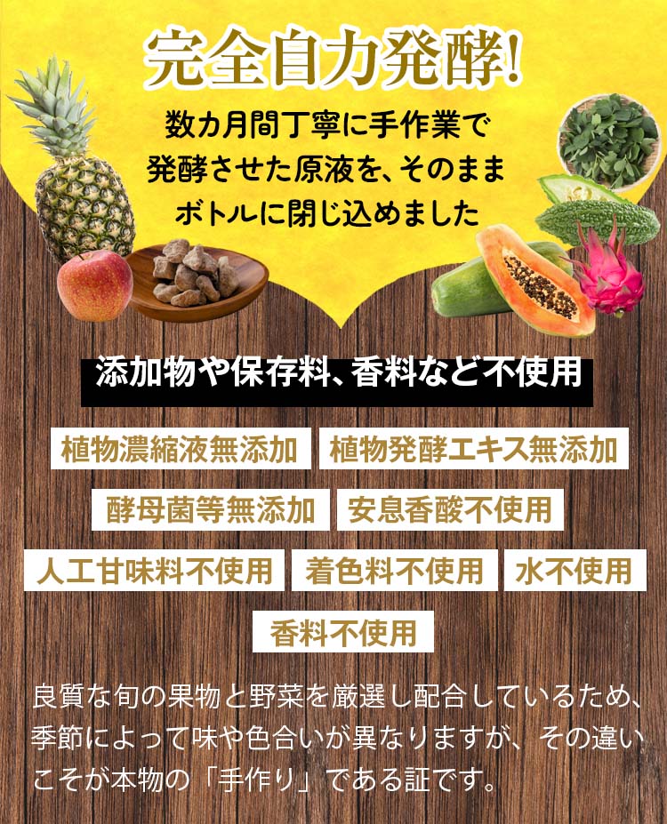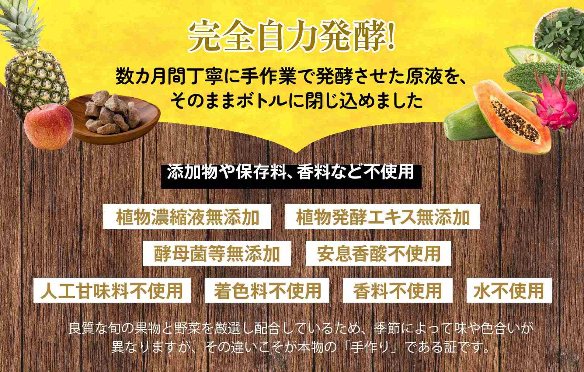 完全自力発酵・酵母菌等無添加・植物発酵エキス無添加・植物濃縮液無添加・安息香酸不使用・着色料不使用・人工甘味料不使用・香料不使用・水不使用そして、指定添加物以外も不使用の酵素ドリンクを探すのは至難の業でしたから、専門家のアドバイスも頂いたうえで一から創り上げました。