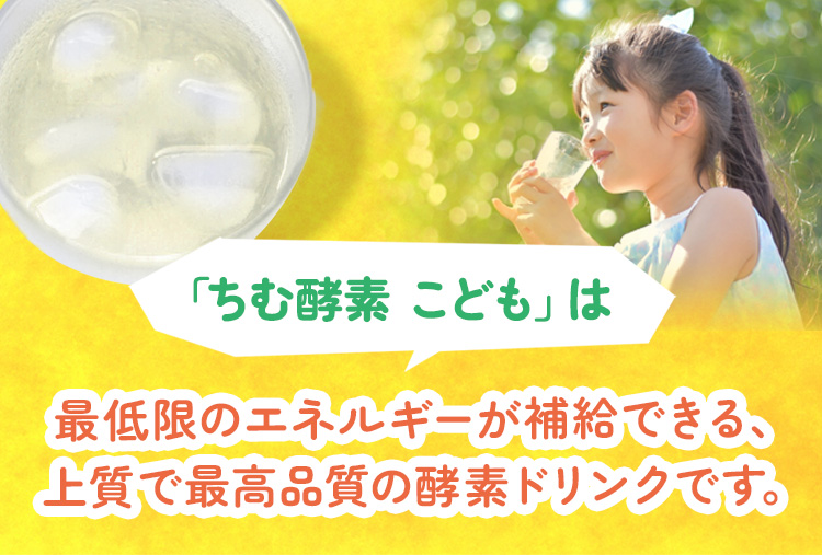 子どもの人生は始まったばかりです。 今がまさに一生もののカラダを創り上げている時。 そして子どもは毎日たくさん遊び、たくさん学び、たくさんエネルギーを消費しています。 《ちむ酵素こども》はお子様の食育の為に開発された酵素ドリンクです。 朝ご飯をパンやシリアルだけのご家庭は食事にプラスしてください。 おやつに、砂糖や添加物たっぷりのお菓子を与えているご家庭はジュースやおやつがわりにどうぞ!上質なピュアエネルギーを手軽に美味しく補給してあげましょう。 ドリンクのほのかな甘みが余計な糖分を欲しなくなります。