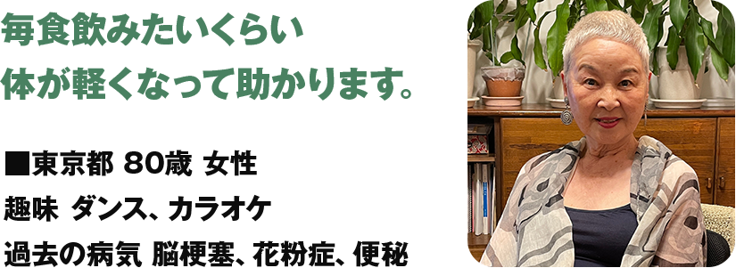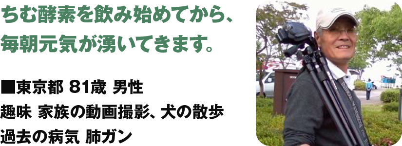 娘の勧めで毎朝飲んでいます。 もともと甘い飲み物は苦手だったのですが、肺癌になったのをきっかけに自分の体を大切にするようになり、良い物なら続けようと思って飲み始めました。 朝は犬の散歩に行くのが日課なのですが、以前は朝は体の不調を感じる事が多く、少し面倒だなと思って妻に代行してもらう事も多かったのですが、ちむ酵素を飲み始めてからは、朝から元気が湧いて活動しています。 犬の飼い主仲間からは、「どうしてそんなに元気に歩いて若々しくいられるのか?」とも、度々言ってもらえるようになりました。 少し前まで休みがちだったテニスの同好会にも、週に一度ですがまた参加していて毎週の楽しみが復活できました。 あまり甘い物は飲まないのですが、水で薄めて飲んでいます。 これからも毎朝飲み続けたいと思っています。